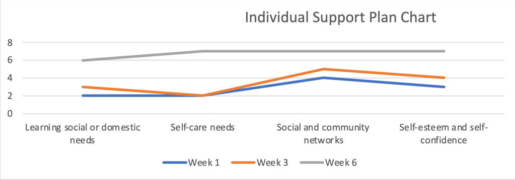 To measure the effectiveness and success of the service we provide, you can see from our evaluation when working with A. Firstly, we carried out an assessment with A and she met our criteria to access the mentoring service. A is a resident of Derby city, she had been diagnosed with having a severe case of Covid 19. She was admitted to the Intensive Care Unit at the Royal Derby hospital and placed on a ventilator machine; A was later placed in an induced coma while she was being treated. A, spent several weeks in hospital and was discharged from hospital to her parent’s home to convalesce, with a supply of oxygen. Fortunately, A recovered but temporary lost her ability to meet her own personal care needs or mobilise independently, she experienced some communication problems and brain fog but what was most disturbing was the loss of her identity as a mother and the second daughter for her parents. A was left feeling low in mood and depressed. Following a referral and being accepted to the charity, a mentor was allocated to A. The mentor would call A once a week on a Tuesday at 10 AM for an hour mentoring session. At the beginning of the first session the mentor completed the Individual Support Plan with A, and she scored the following: